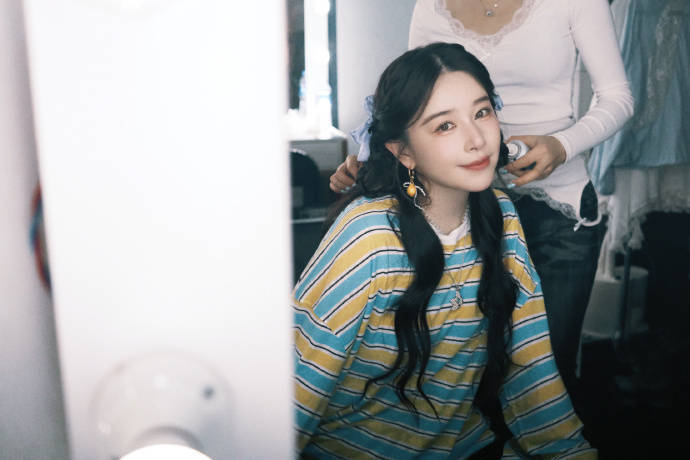 这次造型藏着不少小心机:蓝黄撞色条纹衫自带千禧年复古滤镜,双马尾特意扎成"垂耳兔"弧度,发尾微微外翘显得灵动又减龄。最绝的是眼妆,化妆师用薄荷绿眼影晕染眼尾,和琥珀色瞳孔形成渐变效果,粉丝都说"像把春天揉进眼睛里"。对比一公的国风花仙子造型,这次甜酷风突破超大,连工作室都忍不住发花絮照催她"交出九宫格自拍"。